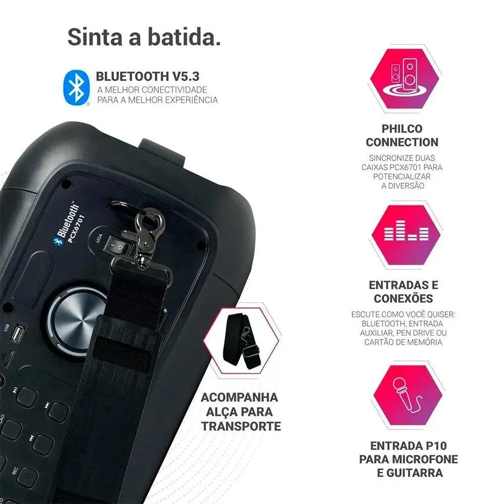 Caixa de Som Amplificada Philco PCX6701 Bluetooth/Aux/USB, Bateria Até 12 Horas, 650W, Preto.
