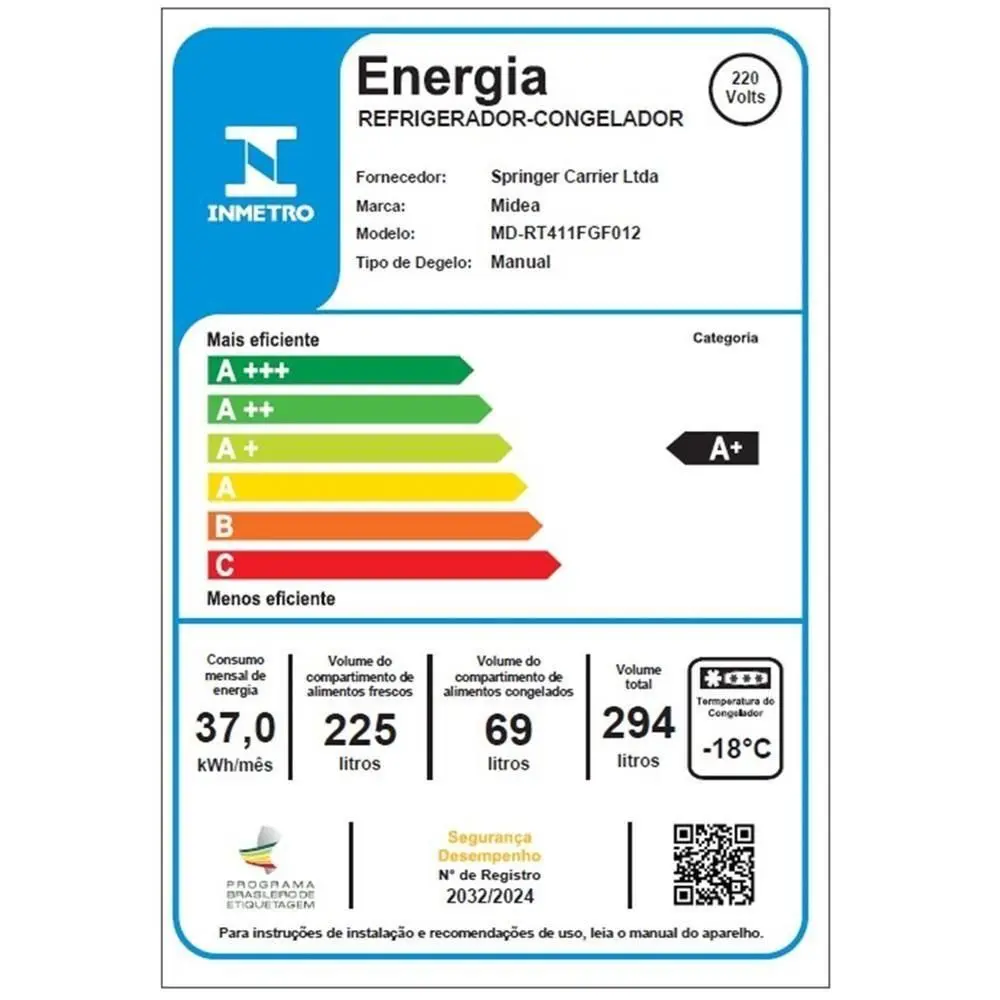 A geladeira/refrigerador duplex Midea MD-RT411 na cor branca, veio para proporcionar um amplo espaço para preservar seus alimentos e bebidas, graças a capacidade líquida total de 294L, sendo 69L no freezer e 225L no refrigerador. Com ampla capacidade, oferece espaço de sobra para armazenar os alimentos de toda a família. Ela tem degelo manual com Sistema Cycle Defrost, onde é necessário o processo manual de degelo para essa geladeira. Possui prateleiras de vidro, tornando mais fácil a limpeza e organização, além de contar com um gavetão hortifruti, para armazenagem mais prática de frutas, legumes e verduras. Ela também é econômica, com classificação A+.