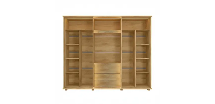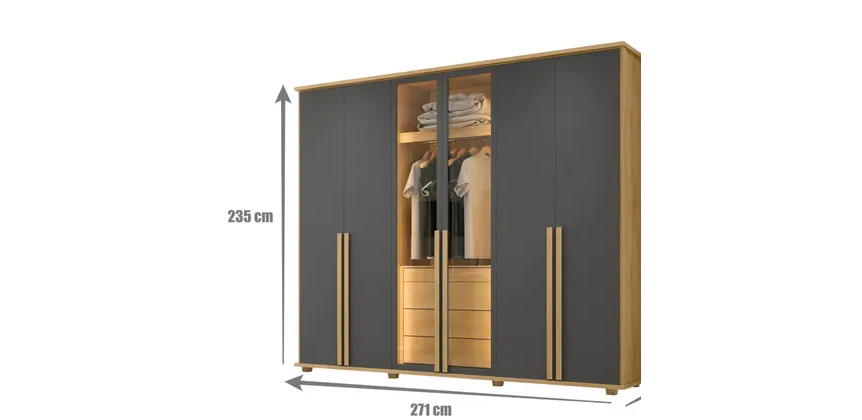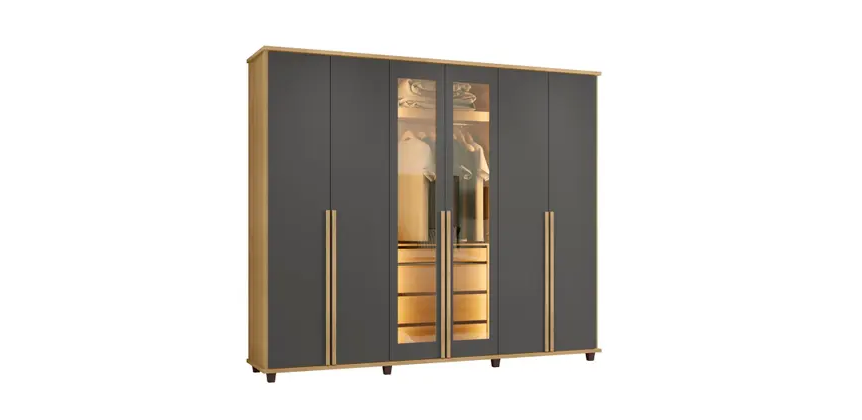 Desfrute de 6 portas, 5 gavetas com corrediças telescópicas para abertura suave, 5 cabideiros em alumínio e 8 nichos internos para organização impecável. Uma prateleira adicional e uma gaveta organizadora complementam o interior, que possui acabamento na cor do produto. O grande diferencial é a Iluminação LED interna, que proporciona visibilidade e sofisticação, facilitando a escolha de suas roupas. Puxadores em MDF e 10 pés